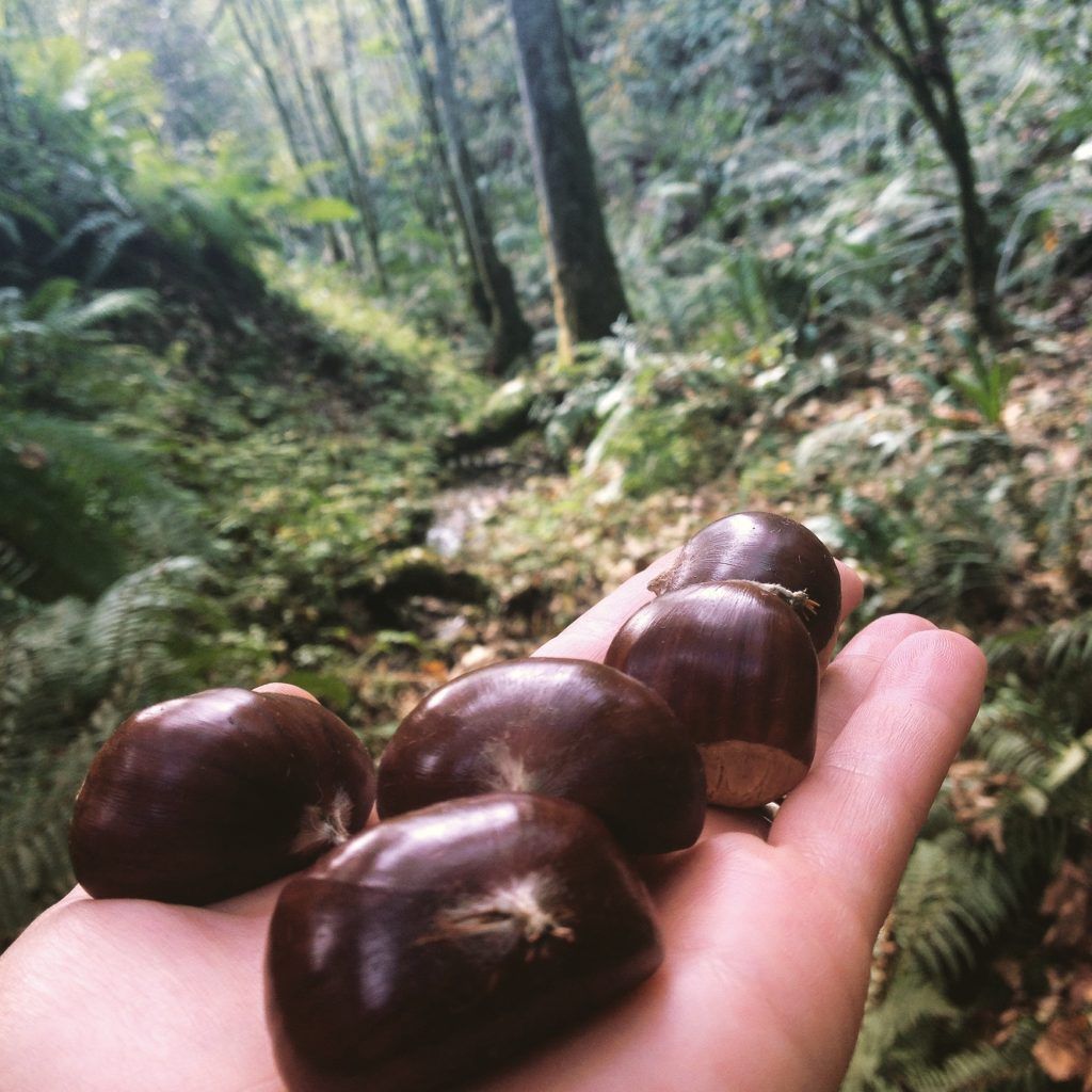 Visita al bosque comestible, cosecha de castañas y amagüestu.